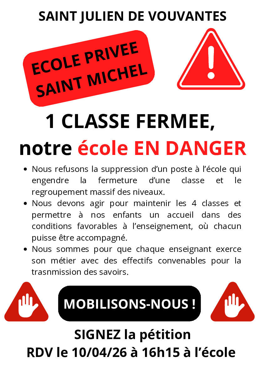 Mobilisons-Nous 06/04/2026 FERMETURE DE CLASSE ÉCOLE SAINT-MICHEL SIGNEZ LA PÉTITION LE 10 AVRIL 2026 A 16 H 15 A L’ÉCOLE