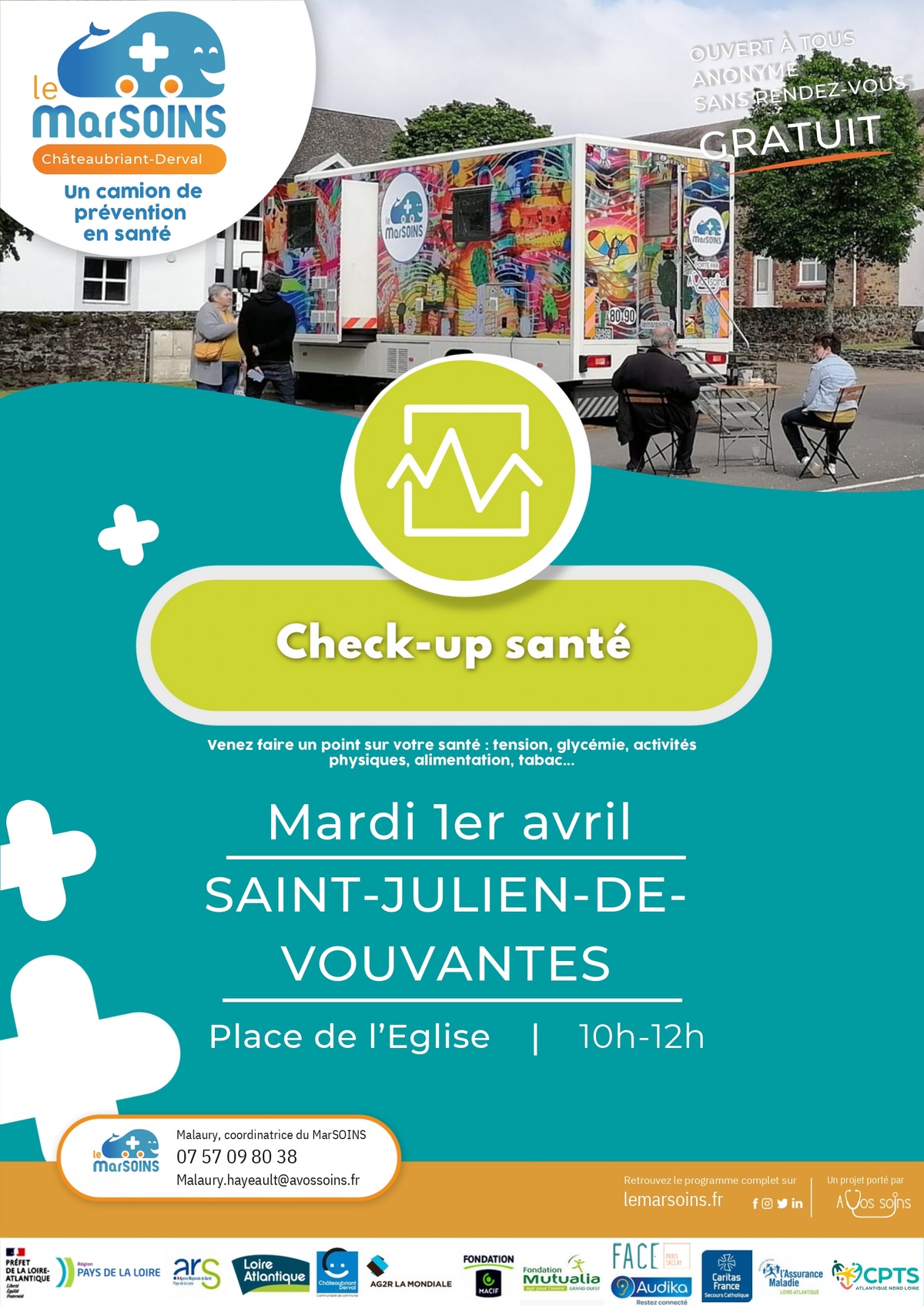 LE MARSOINS 23/03/2025 PERMANENCE LE MarSOINSCHECK'UP SANTE MARDI 1 AVRIL 2025 DE 10h A 12h PLACE DE L'EGLISE Source : Mairie de Saint-Julien-de-Vouvantes