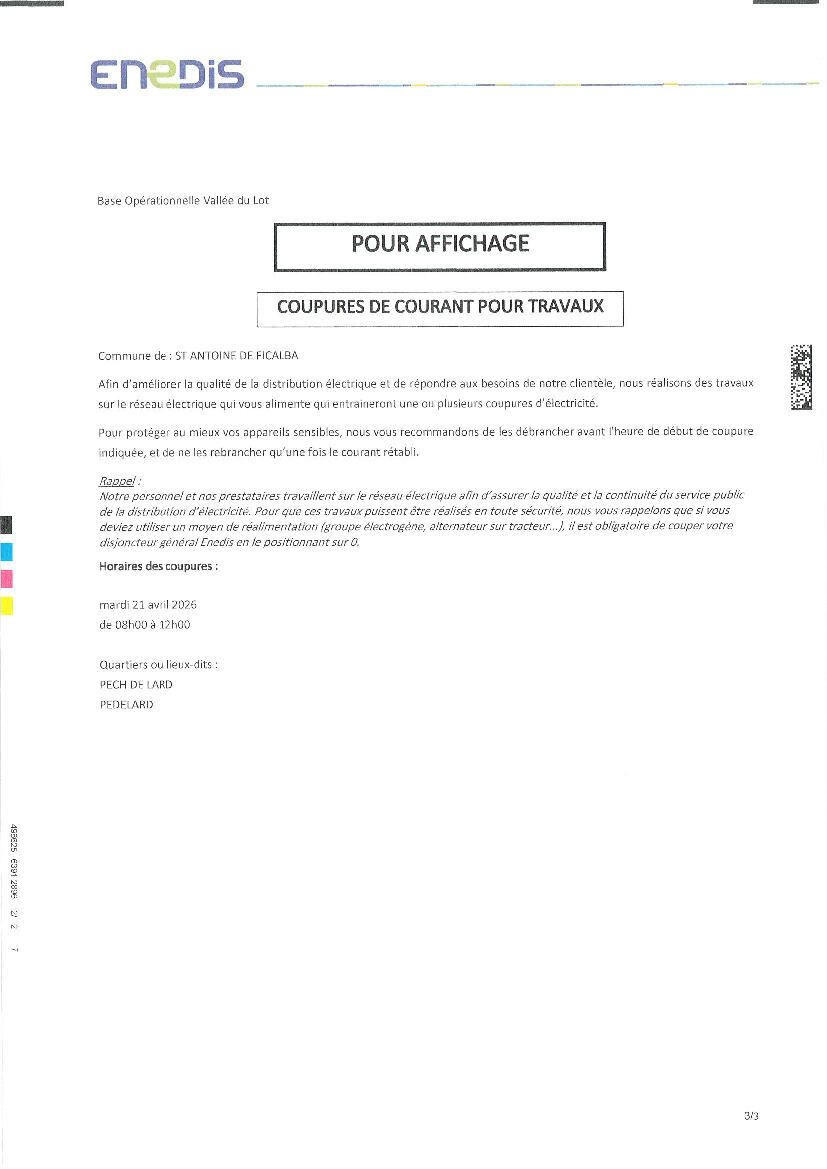 2 avis de coupure de courant 03/04/2026 Ci-joint, 2 avis de coupure de courant , pour les lieux-dits Landier, Pech de lard et Pedelard, les 21 et 23 avril.