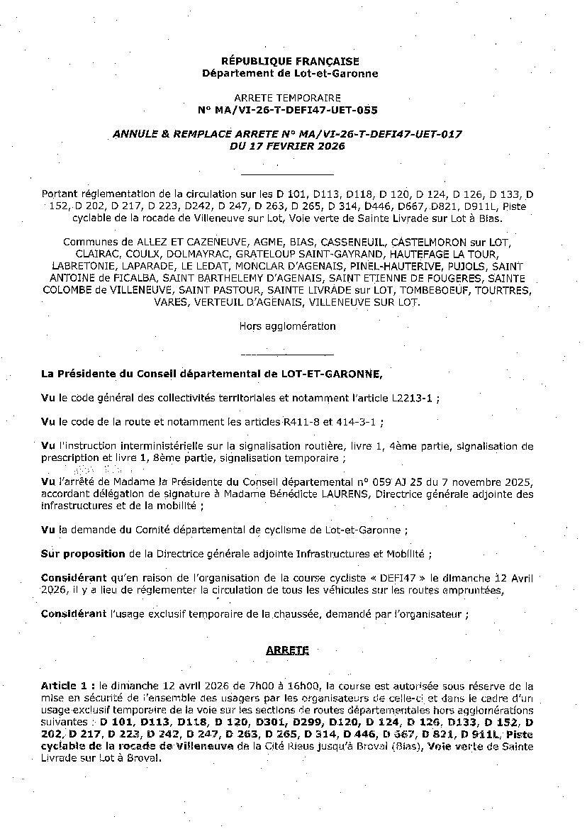 En p.j, l'arrété Départemental concernant la course cycliste qui passera, entre autre, sur la commune de St Antoine le dimanche 12 avril 2026