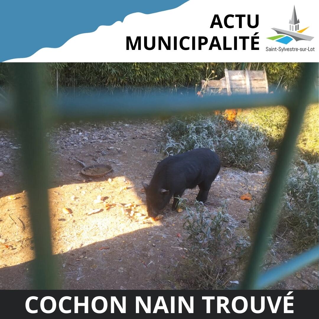 Ce cochon nain a été trouvé en divagation sur la commune. Il a été mis en sécurité. Si vous le reconnaissez, merci de contacter la mairie au 05 53 41 24 58 afin de le restituer à son propriétaire.