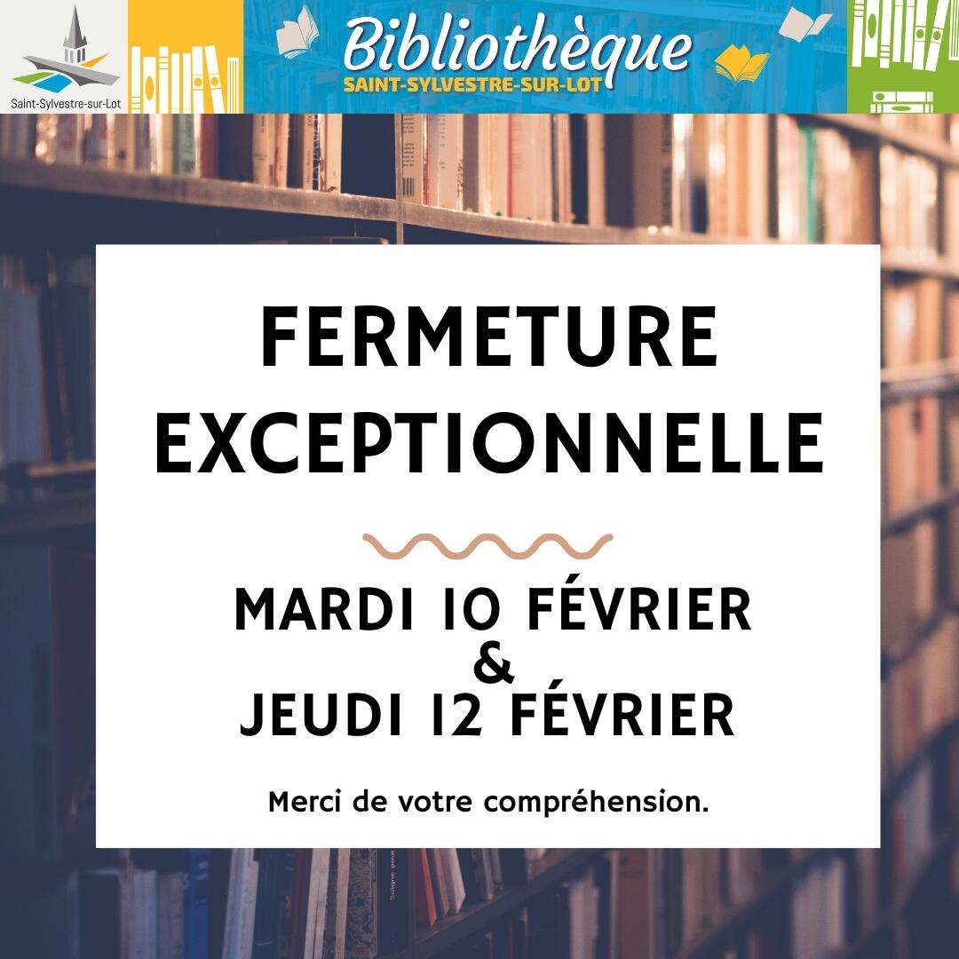 Fermeture exceptionnelle de la bibliothèque 30/01/2026 La Bibliothèque sera exceptionnellement fermée mardi 10 et jeudi 12 février 2026.