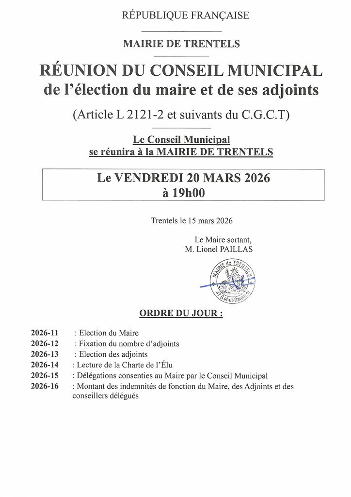 Le conseil municipal d'installation (élection du Maire et des Adjoints)  se tiendra le vendredi 20 mars 2026 à 19h à la mairie.