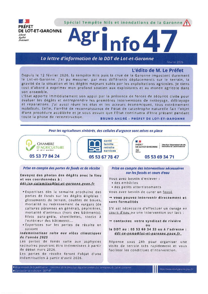 Vous trouverez la lettre d'information de la DDT de Lot-et-Garonne sur les différentes cellules d'urgence mises en place pour accompagner les sinistrés.