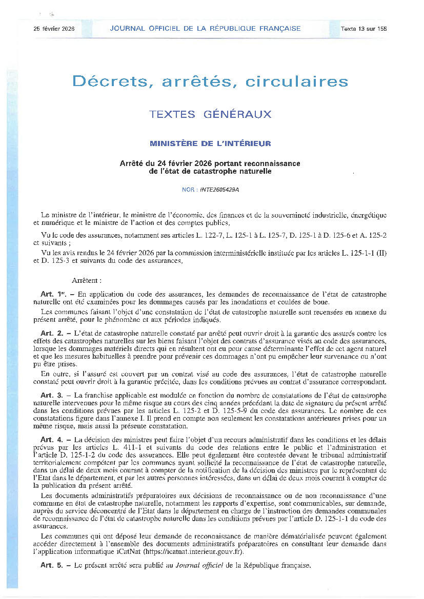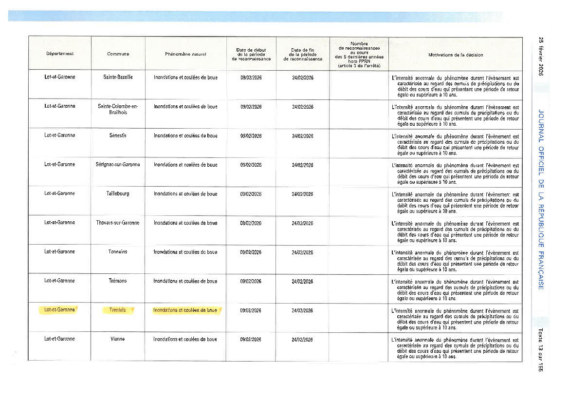 Pour information, la commune de Trentels a été reconnue en état de catastrophe naturelle pour débordement d'un cours d'eau (Lot), inondations et coulées de boue par arrêté ministériel au Journal Officiel du 25/02/2026