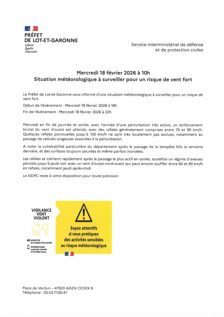 Nous recevons une information Préfectorale mettant en garde contre des vents violents entre 18H00 et 22H00 ce mercredi 18 février 2026.