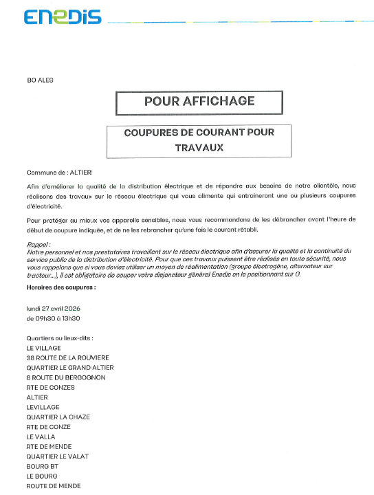 Coupure ENEDIS 27 avril de 9h30 à 13h30 ALTIER