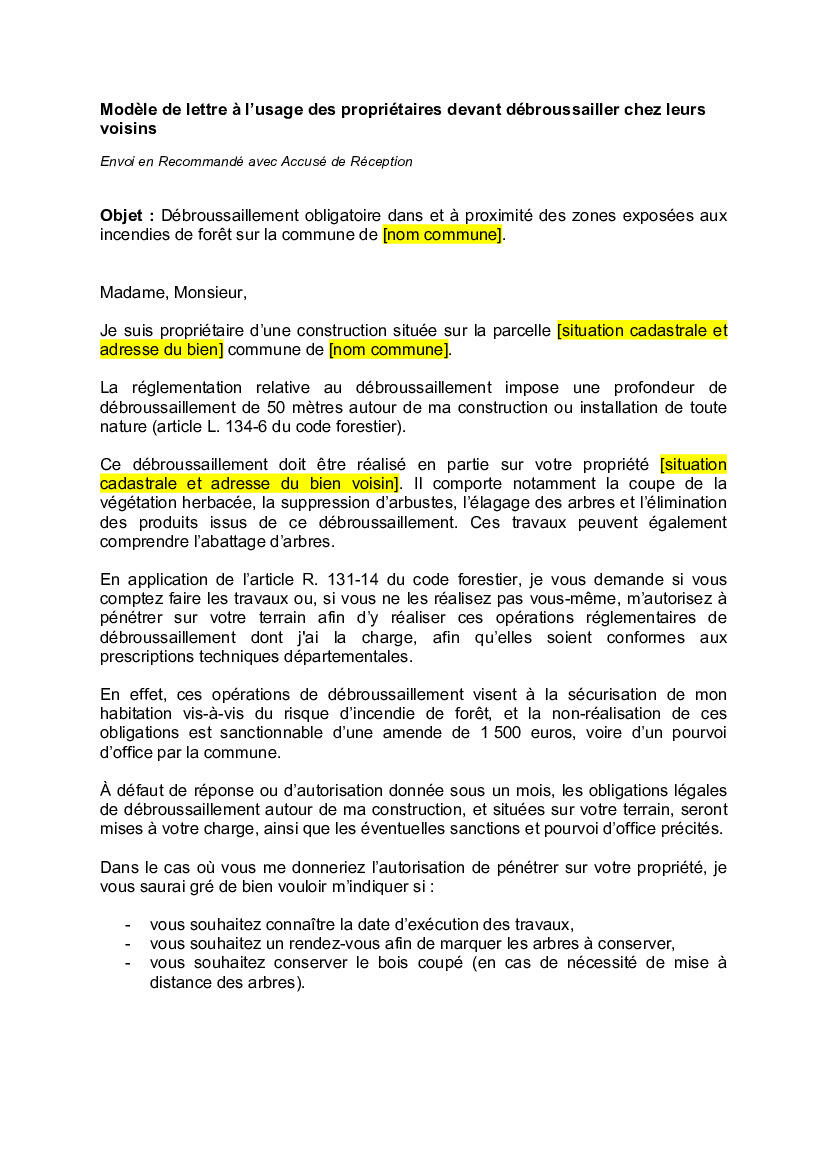 Bonjour, vous trouverez en pièce jointe une brochure informative sur l'obligation légale de débroussaillement (OLD), ainsi qu'un modèle de lettre.