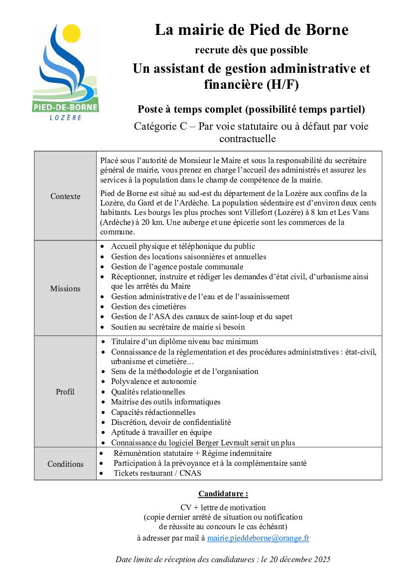 Offre emploi - Adjoint administratif - Mairie Pied de Borne