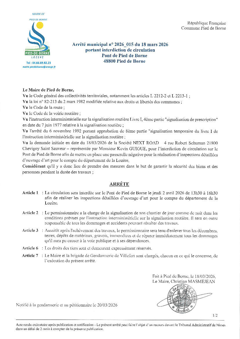 Restrictions circulation 2 avril Pont de Pied de Borne