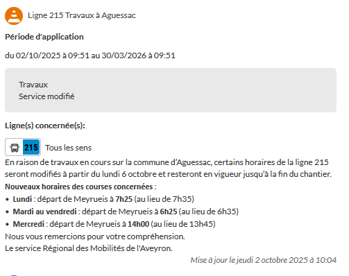 LIGNE 215 TRAVAUX AGUESSAC