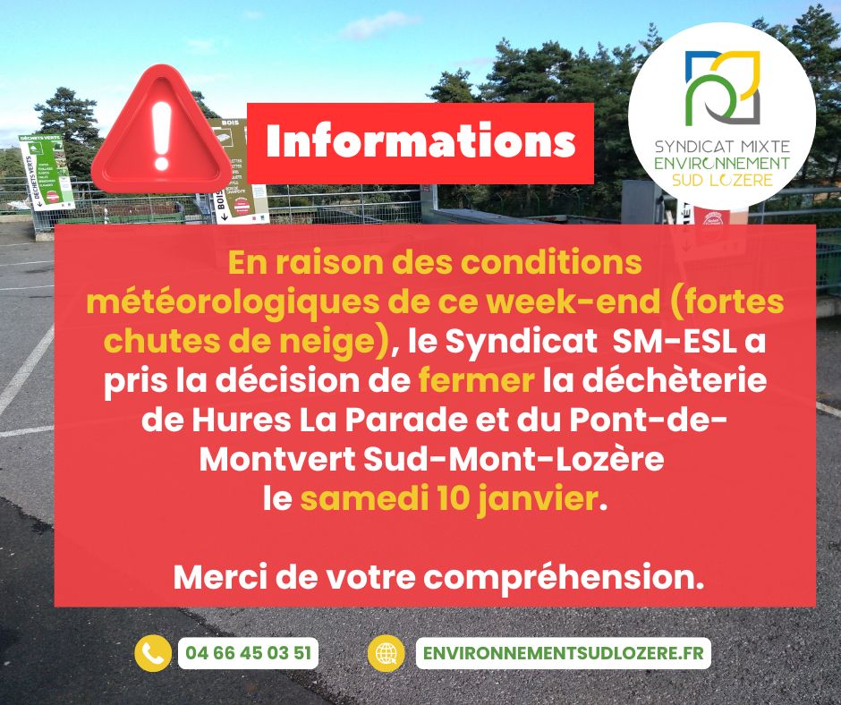 En raison des conditions météorologiques annoncés, la déchèterie sera exceptionnellement fermée, cette fin de semaine.