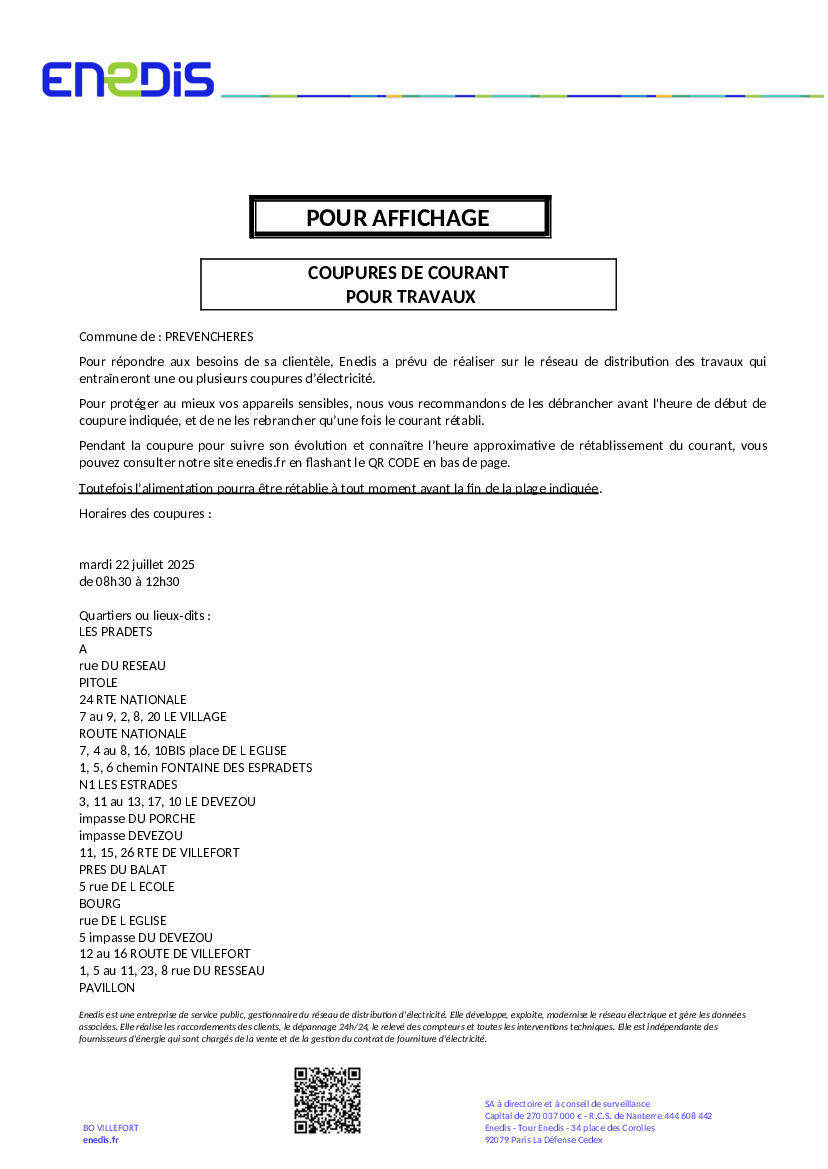 coupure ENEDIS pour Travaux sur la commune de Prévenchères