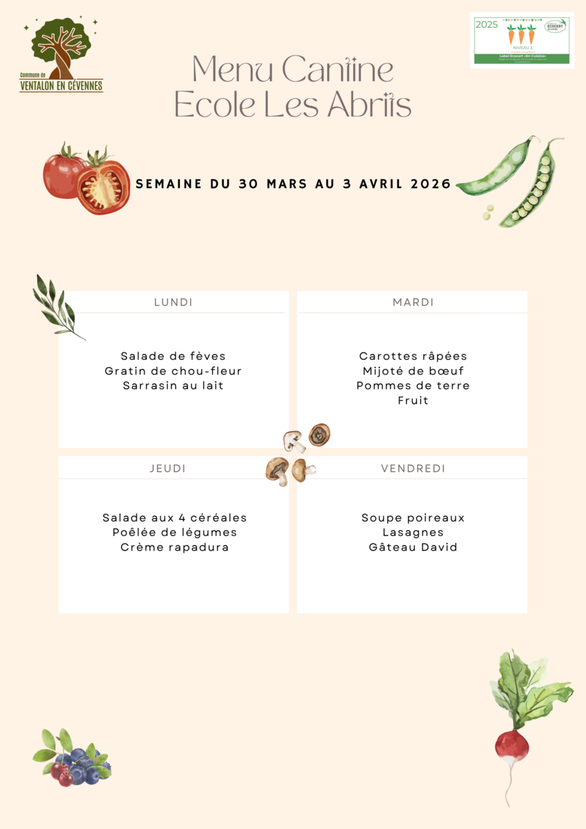 Menu cantine du 30 mars au 3 avril 2026