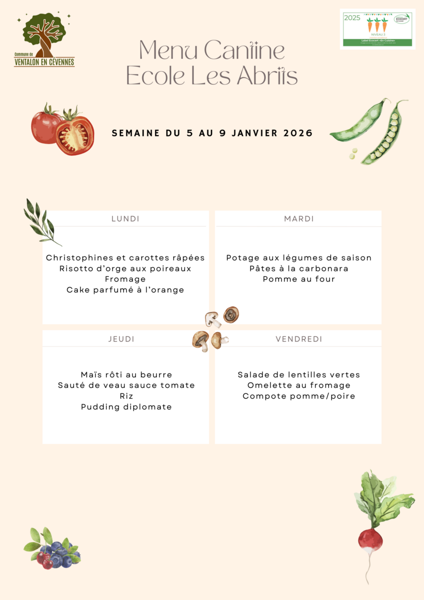 Dès le début du mois de janvier, les enfants se retrouveront avec plaisir à la cantine des Abrits pour entamer une nouvelle semaine de menus. Après les repas festifs et les vacances bien méritées, place à des repas équilibrés, savoureux et pensés pour bien démarrer l’année.