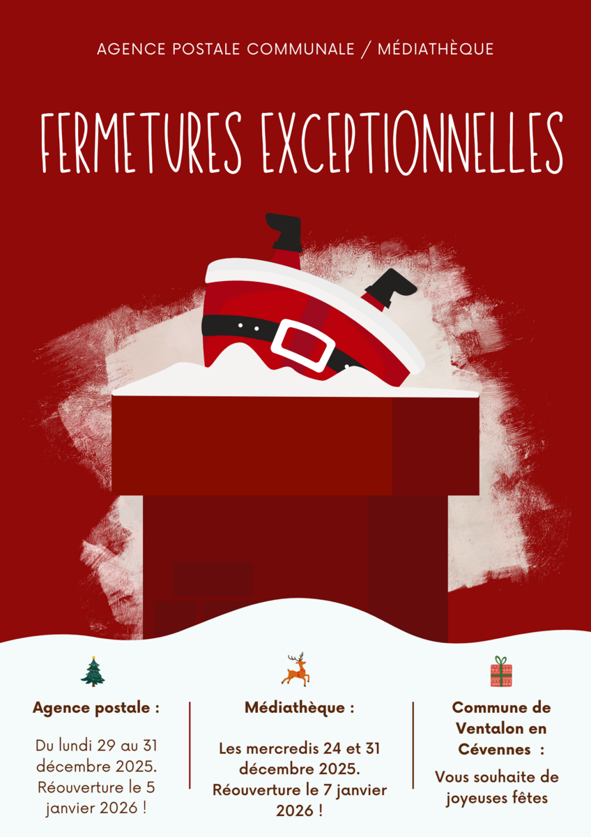 L’agence postale communale sera quant à elle fermée du 29 au 31 décembre 2025. Si vous souhaitez envoyer vos colis de Noël ou de la nouvelle année, pensez à anticiper votre venue. L’agence rouvrira ses portes le lundi 5 janvier 2026.
