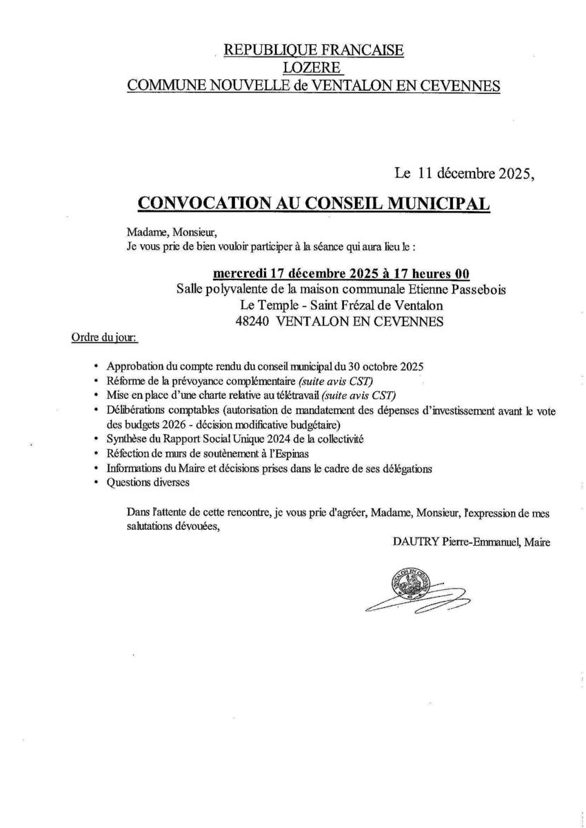 Prochain Conseil Municipal Le Mercredi 17 Décembre ! 15/12/2025 Le prochain conseil municipal de Ventalon en Cévennes aura lieu le mercredi 17 décembre 2025 à 17h00 à la salle polyvalente de la maison communale Etienne Passebois. Voici l'ordre du jour !