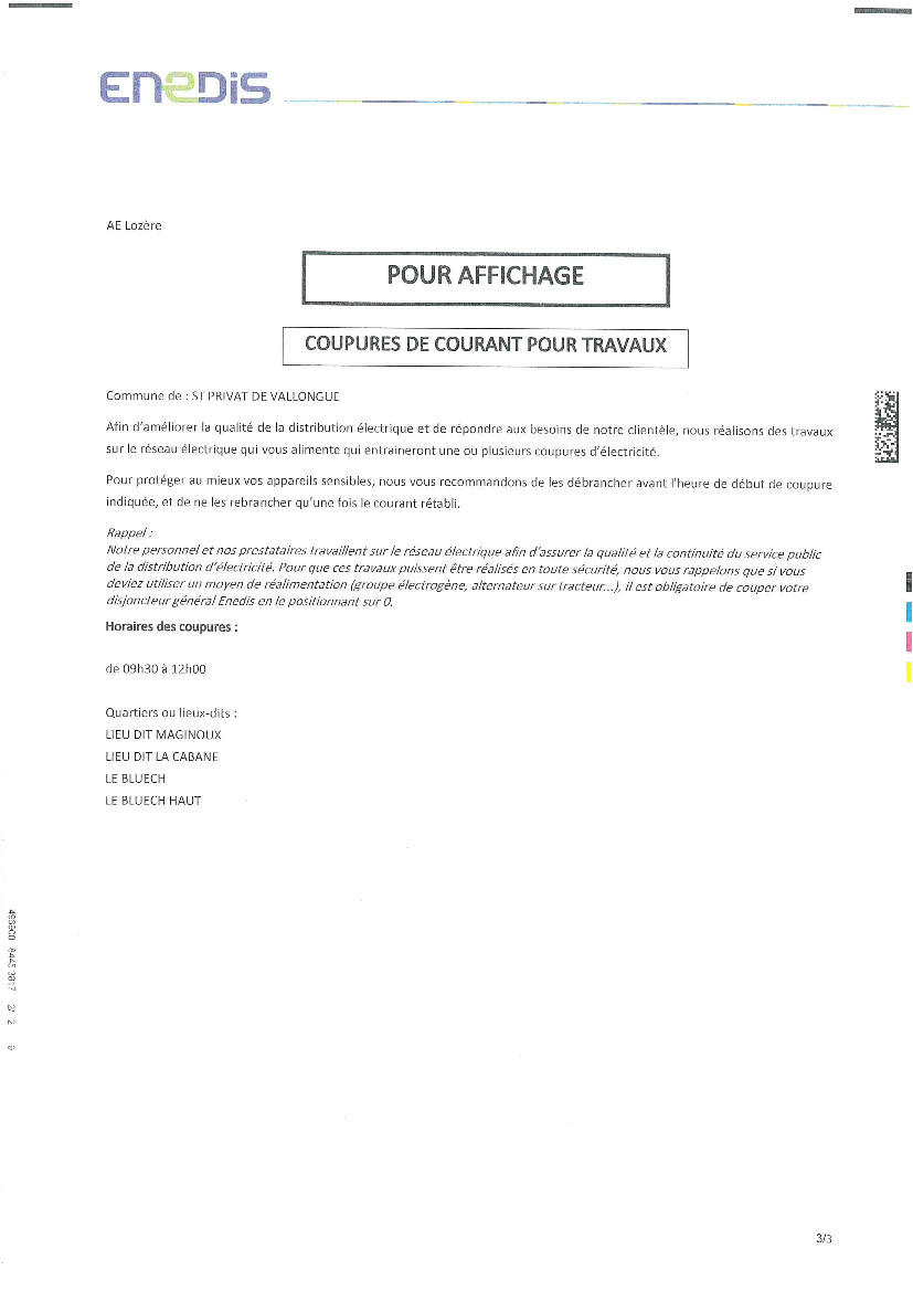 Pour information, ENEDIS prévoit une coupure de courant pour travaux le mardi 10 mars 2026 de 09h30 à 12h00 sur les lieux-dits :