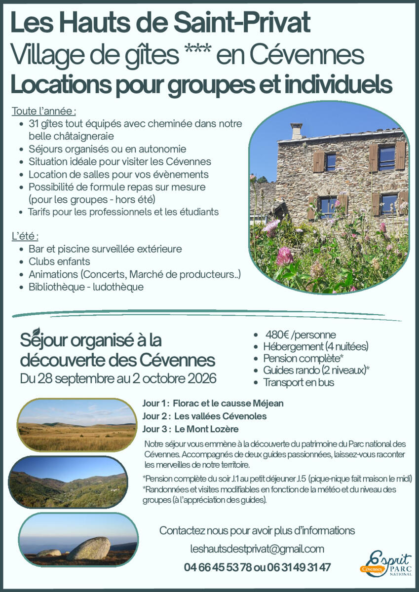 Pour information, le village de vacances les Hauts de Saint Privat organise depuis quelques mois des séjours sur mesure pour des personnes et groupes désireux de découvrir les Cévennes