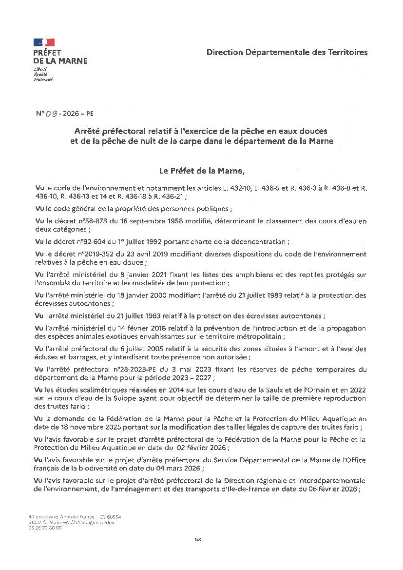 Arrêté préfectoral relatif à l'exercice de la pêche en eaux douces et de la pêche de nuit de la carpe dans le département de la Marne.