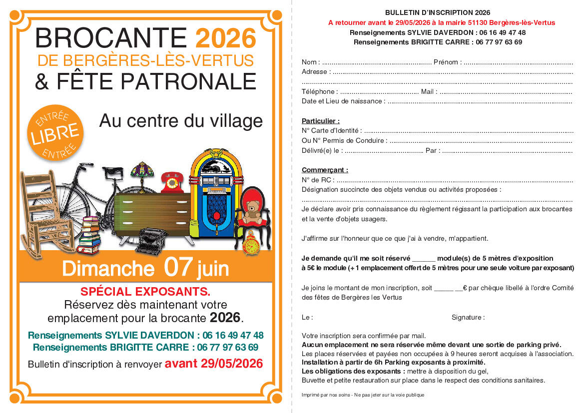 Inscriptions pour BROCANTE - dimanche 7 juin 2026