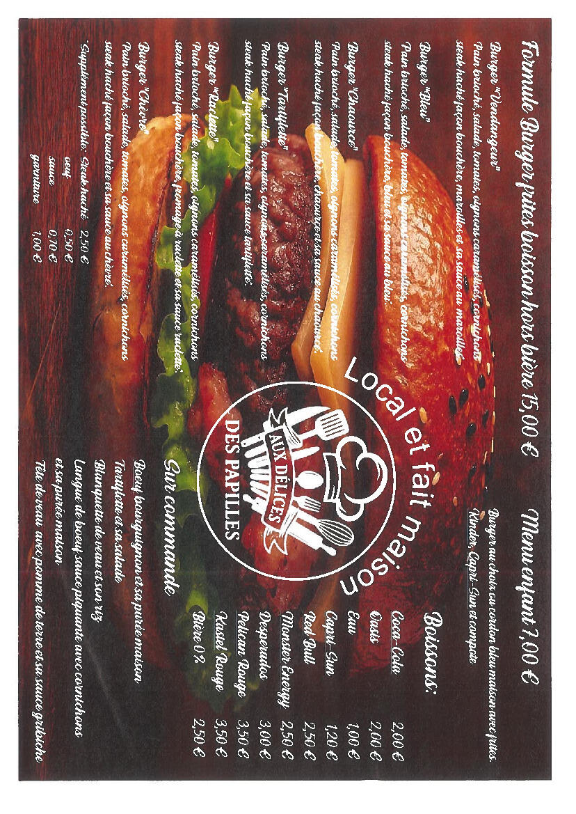 Bonjour, pour rappel, le Food truck "Aux délices des papilles" est présent chaque jeudi à partir de 18h parking Place de l'église. Vous trouverez sa carte en annexe. Cordialement