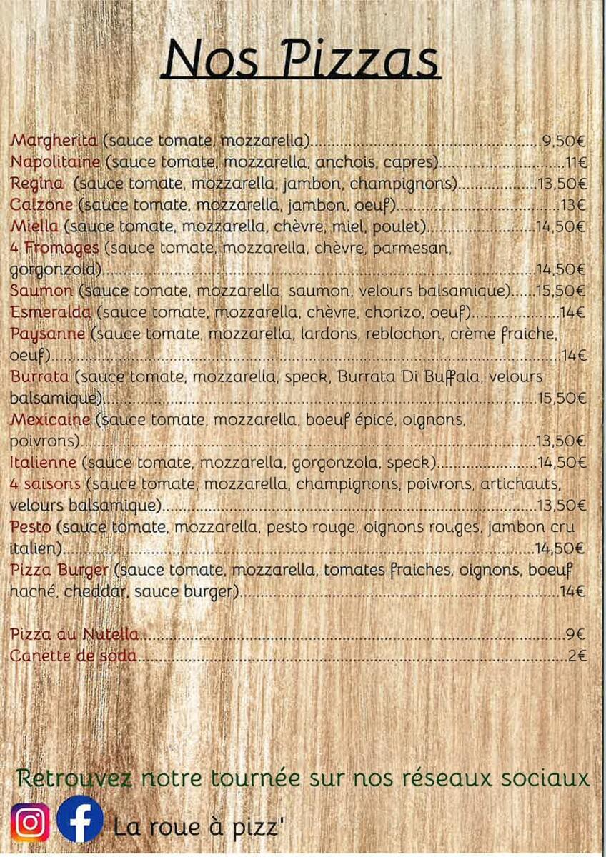 Retrouvez les produits proposés par la Roue à Pizz', les dimanches de 17H30 à 21H, sur la Place de l'Église.