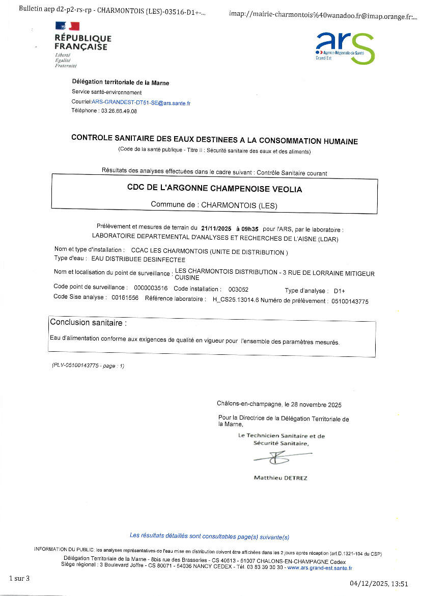 Résultats des analyses d'eau