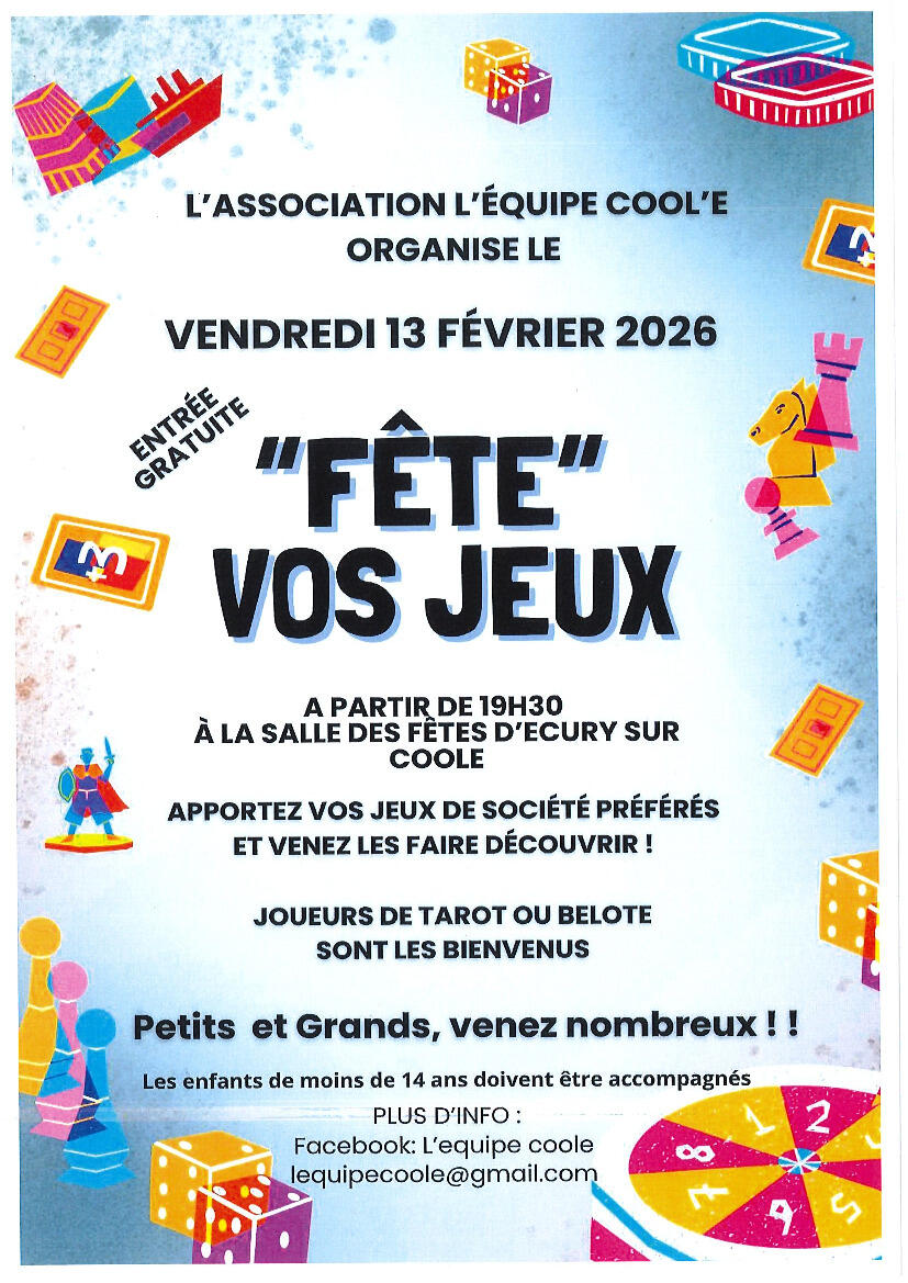 Soirée "Fête vos jeux" 10/02/2026 Rendez-vous pour la soirée "Fête vos jeux" ce vendredi 13 février à partir de 19h30 à la salle des fêtes.