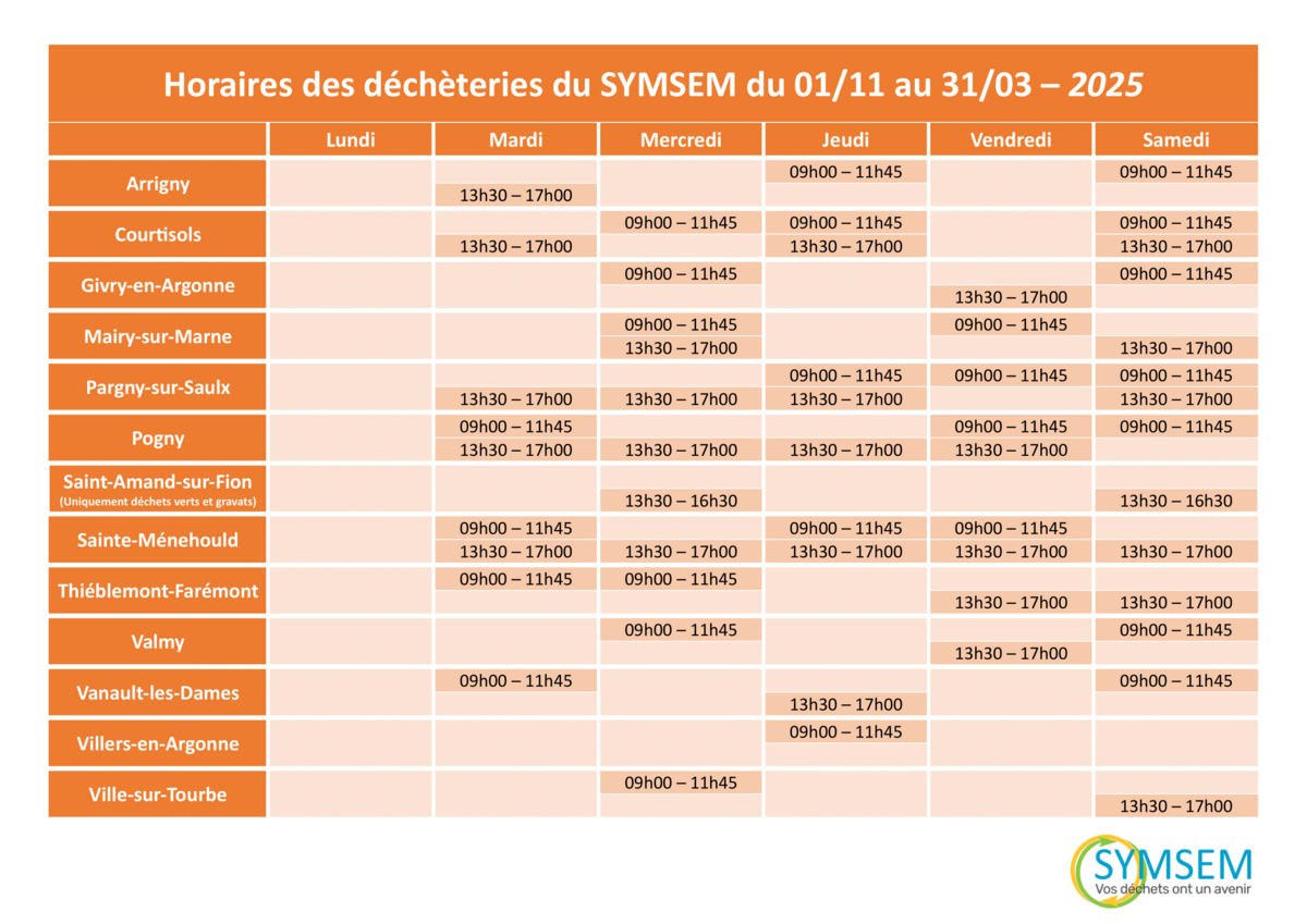 Horaires des déchèteries du SYMSEM