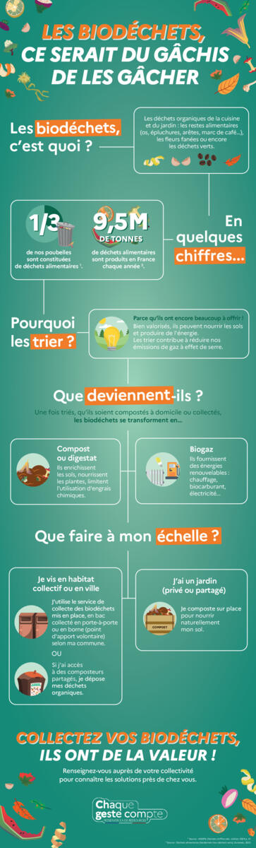 Les déchets alimentaires représentent 9,5 millions de tonnes de déchets en France par an. Correctement triés, collectés et valorisés, ces déchets peuvent devenir une ressource précieuse, au lieu de finir en décharge.