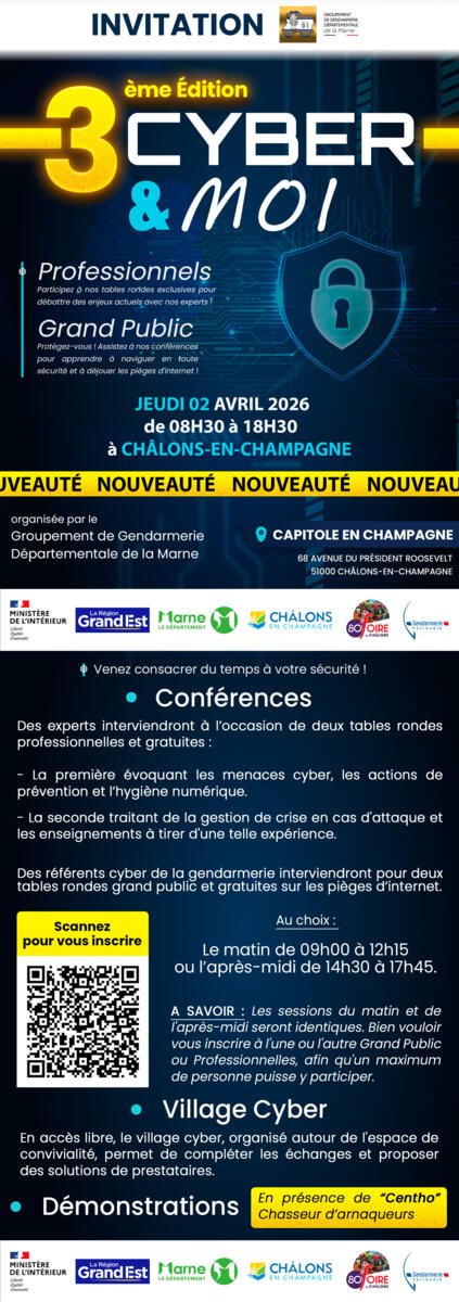 Je me permets de vous rappeler la tenue d'une journée de prévention aux risques cyber et dangers d'internet le 02 avril 2026 au Capitole de Chalons en Champagne.