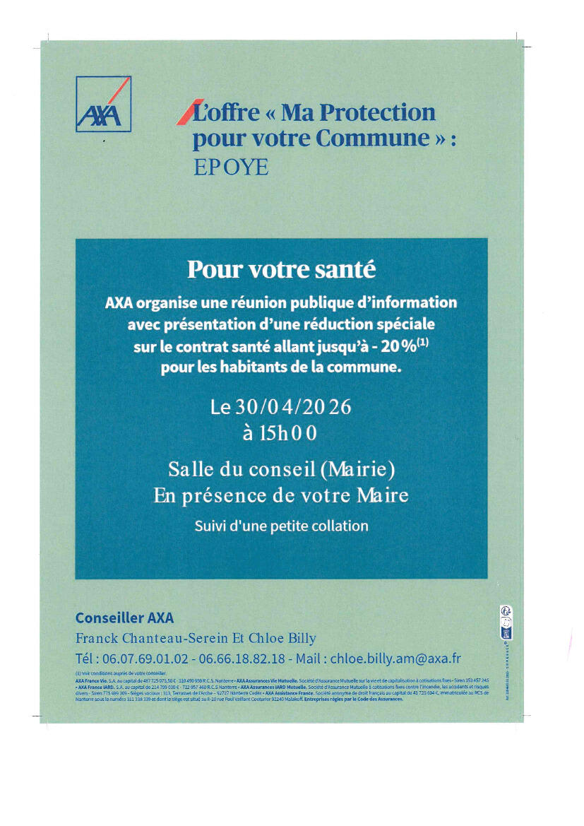 N'hésitez pas à venir à la prochaine réunion d'AXA qui vous présentera ses garanties et tarifs avec réduction en comparaison avec une assurance personnelle prise en agence.
