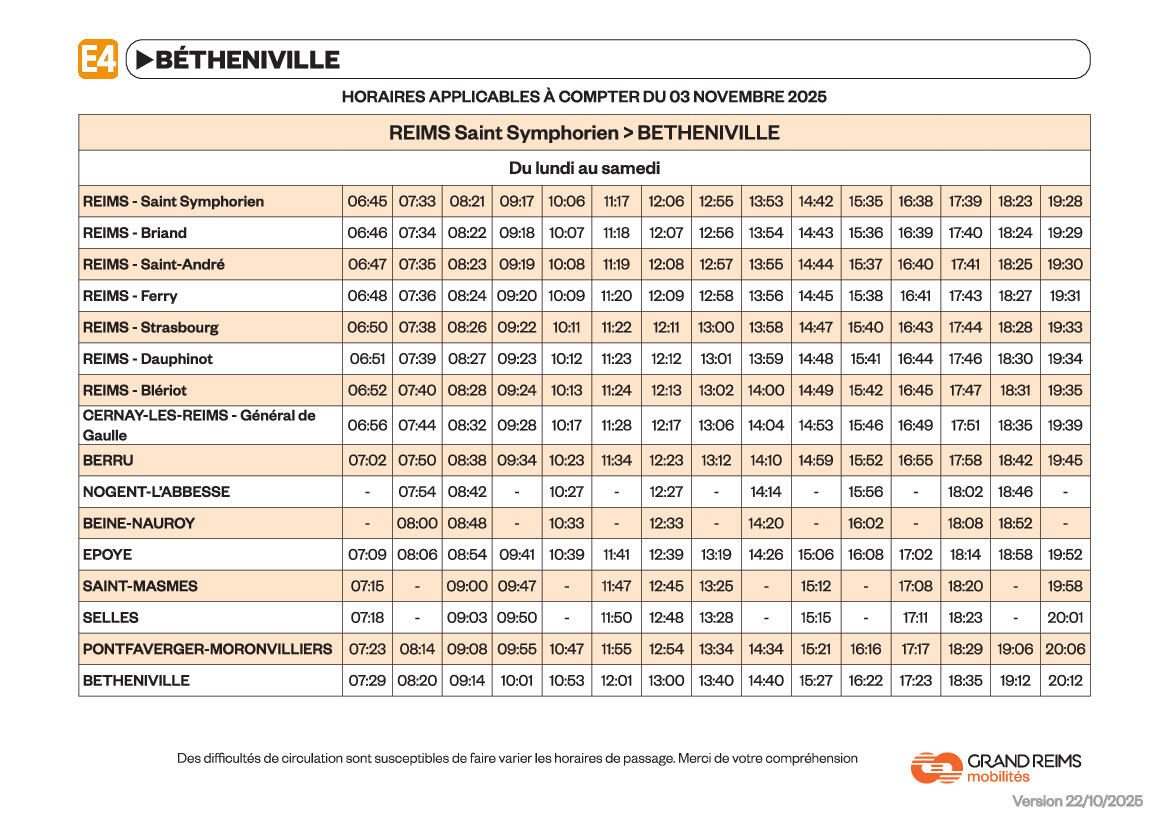 Horaires lignes E4 Grand Reims mobilités