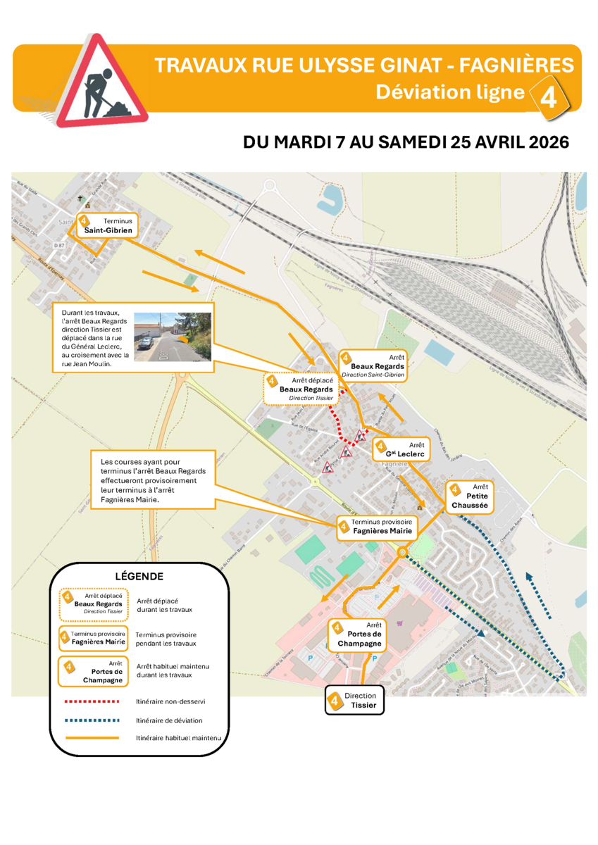 À compter du mardi 7 avril 2026, en raison de travaux dans la rue Ulysse Ginat à Fagnières, la ligne 4 est provisoirement déviées dans les 2 sens de circulation.
