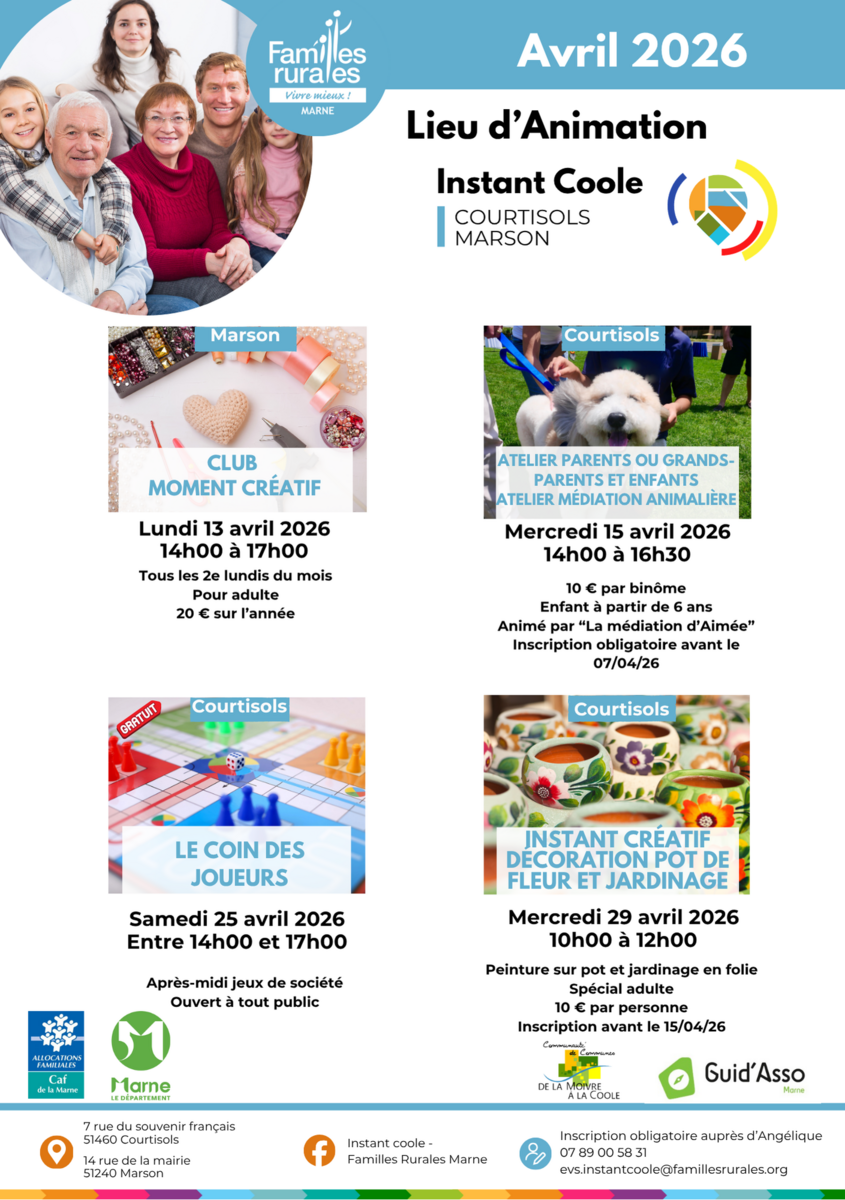 Animations Avril 20/03/2026 Nous avons le plaisir de vous transmettre le calendrier des animations de l'Espace de Vie Sociale Instant Coole pour ce mois d'avril 2026.