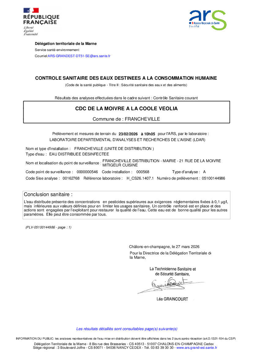 Ci-dessous le bulletin d'analyse du prélèvement du 23/02/2026 sur notre réseau adduction d'eau potable.