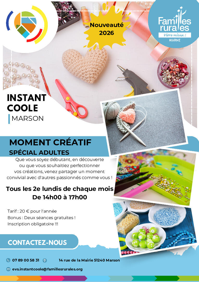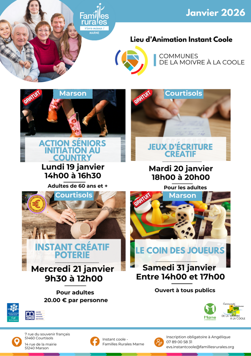 Nous avons le plaisir de vous annoncer les nouvelles animations d'Instant Coole pour le mois de janvier 2026, qui se dérouleront à Courtisols et Marson. Nous avons également le plaisir de vous dévoiler deux belles nouveautés cette année !