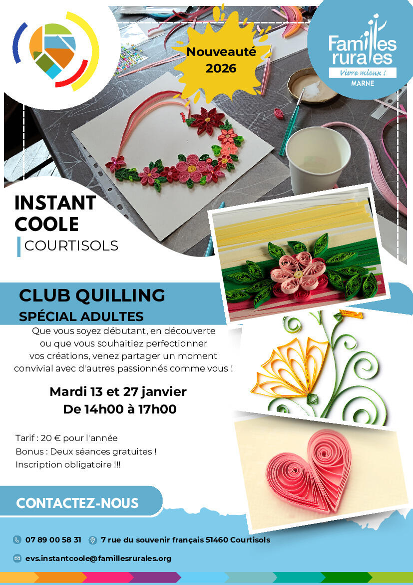 Un nouveau club créatif dédié au quilling (l'art du papier enroulé) ouvrira ses portes à Courtisols, chaque 2e et 4e mardi du mois de 14h00 à 17h00. Venez découvrir cette technique originale et laisser libre cours à votre créativité !