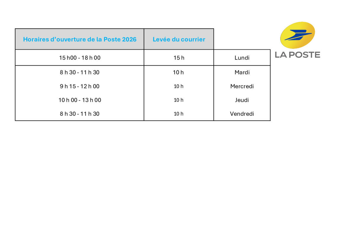 Nouveaux horaires de l'agence postale (rectificatif) 22/12/2025 NOUVEAUX HORAIRES DE L'AGENCE POSTALE COMMUNALE À partir de janvier 2026