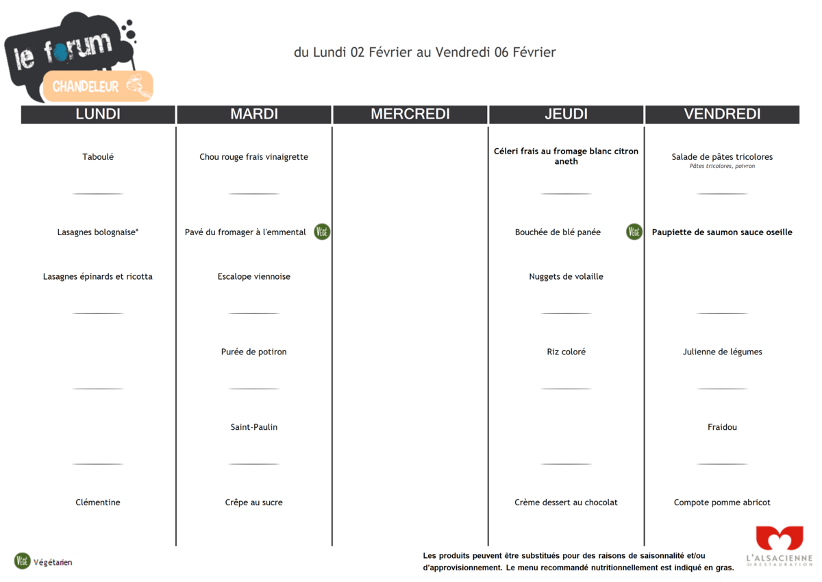 Menus périscolaires du 26 janvier au 06 février 2026.