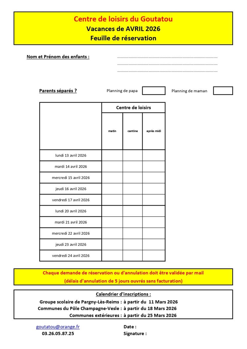 Feuille de réservation - Vacances d'Avril