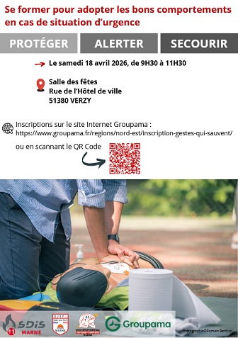 Les sapeurs-pompiers de Verzenay organisent une sensibilisation aux gestes qui sauvent pour tous (à partir de 10 ans) dans le cadre d'un partenariat entre le SDIS de la Marne et son partenaire Groupama.