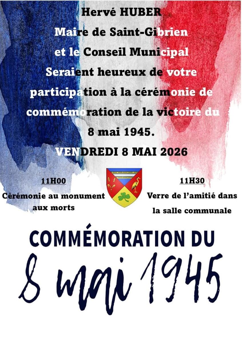 Commémoration de la victoire du 8 mai 1945 le 8 mai 2026 à 11h00 au monument aux morts dans le parc du Château d'eau à Saint-Gibrien.