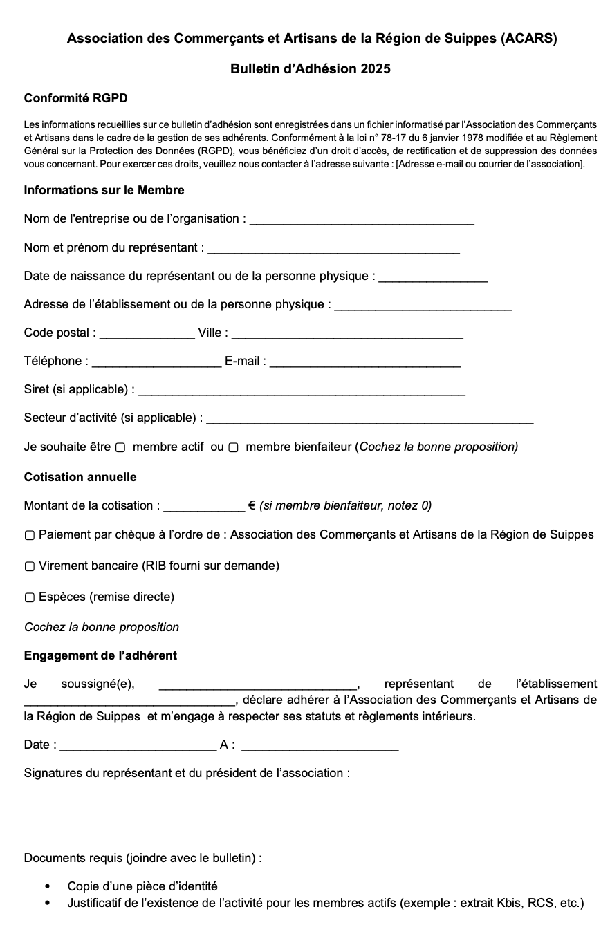 Si vous souhaitez adhérer à l’association des commerçants de la Région de Suippe, compléter ce bulletin et le renvoyer à M. VIGNEULLE Antoine.