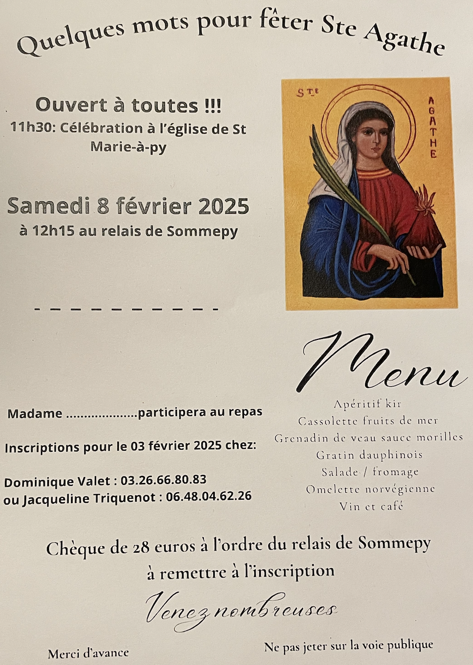 Rappel: Sainte Agathe 01/02/2025 N'hésitez pas à vous inscrire pour la Sainte Agathe, il reste des places!