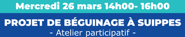 Afin de pouvoir participer à l'élaboration du projet d'aménagement et du projet de vie sociale du futur béguinage, la CCRS et la commune de Suippes sont à la recherche de seniors volontaires pour participer à un atelier participatif le mercredi 26 mars prochain. Animé par Jean-François Trochon de Béguinage et Compagnie, il aura lieu de 14h à 16h dans la salle polyvalente du Centre culturel et associatif Jean Huguin à Suippes.