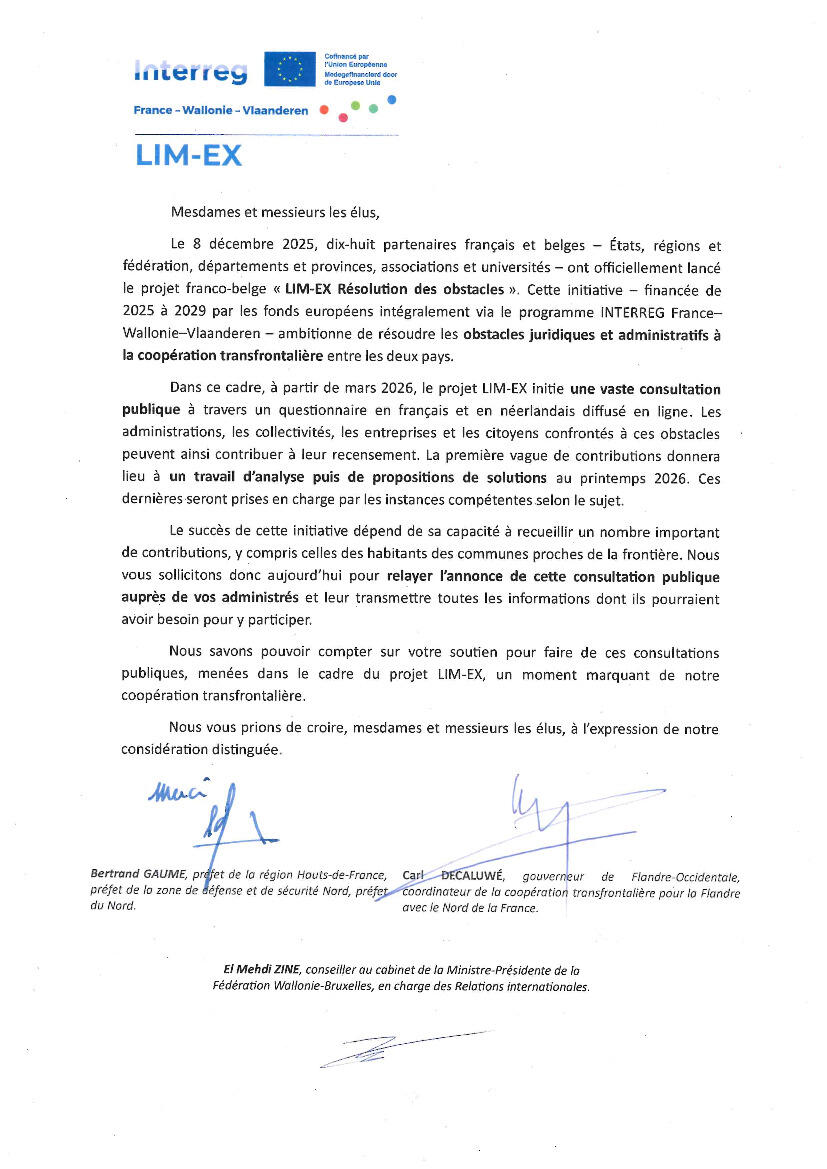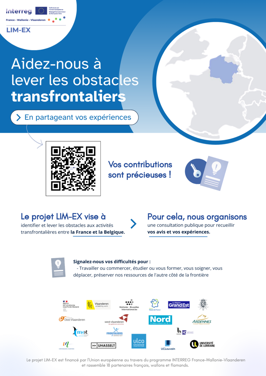 Dans le cadre du projet stratégique LIM‑EX Résolution des obstacles, financé par le programme INTERREG France–Wallonie–Vlaanderen, nous vous invitons à contribuer au recensement des obstacles à la coopération transfrontalière franco‑belge.