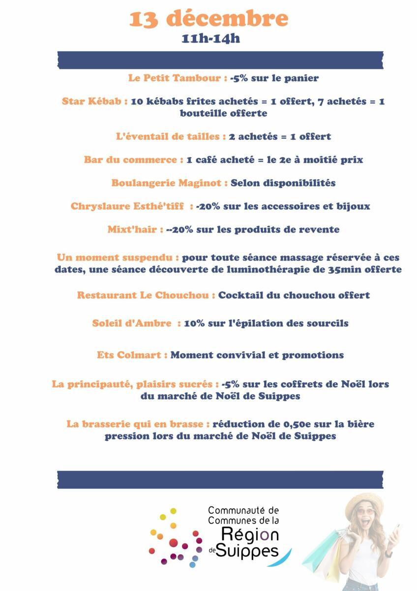 La Communauté de Communes de la Région de Suippes vous invite à profiter des Happy-Hours. Après le 22 août, le 13 novembre, une opération spéciale organisée le samedi 13 décembre de 11h à 14h avec la participation de nombreux commerces locaux.