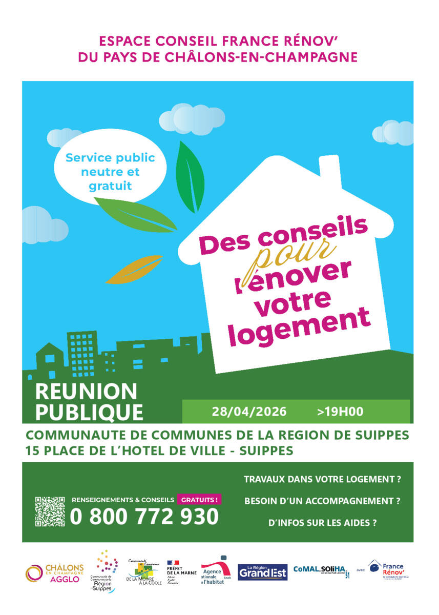 La Communauté de communes de la Région de Suippes vous invite à une réunion publique consacrée aux aides à l’amélioration de l’habitat, animée par les conseillers de l’Espace Conseil France Rénov’ du Pays de Châlons.